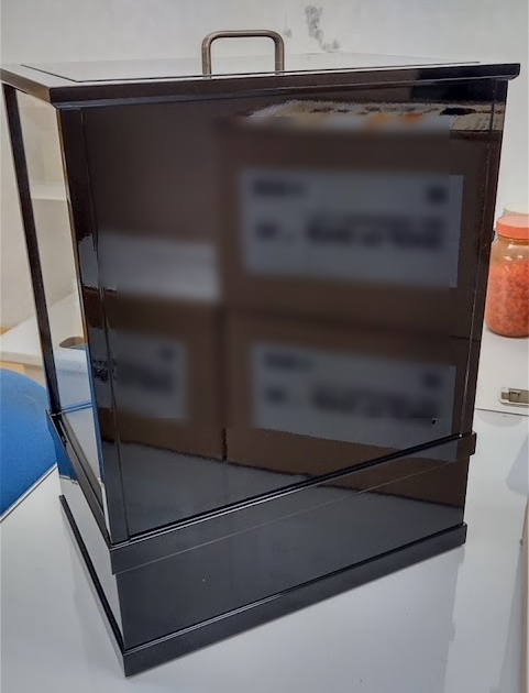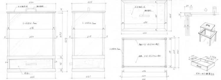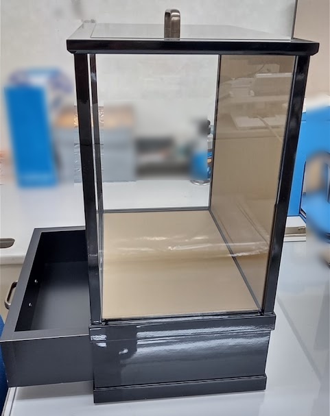 納品 特注 2025/11/14 特注上置きケース製作 飛ヶ谷 飛ヶ谷 Tweet LINEで送る 先日、特注の上置きケースの製作依頼があり製作しました。下記の図面は協力会社の木工所様が作図してくれました。実際に製作し完成した製品になります。ケース内部の背面・底板部分は金色のシートを貼っています。ケース下部は引出しになっており小物が入れられます。上部の取手付き上蓋の取り外しで展示物を出し入れできます。塗装は黒ウレタン塗装の艶あり仕上げになっています。塗装が綺麗なのでケースの後ろに置いてある物が反射します。お客様に大変喜んでいただけました。ありがとうございました。 twitterでツイート facebookでシェア はてなブックマーク LINEで送る