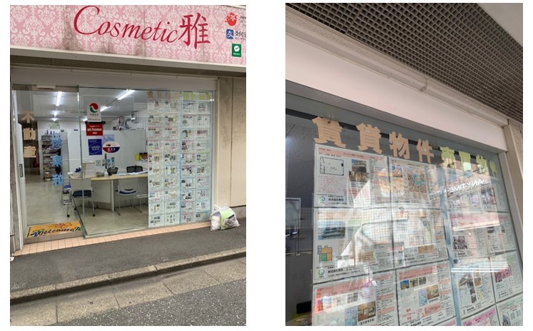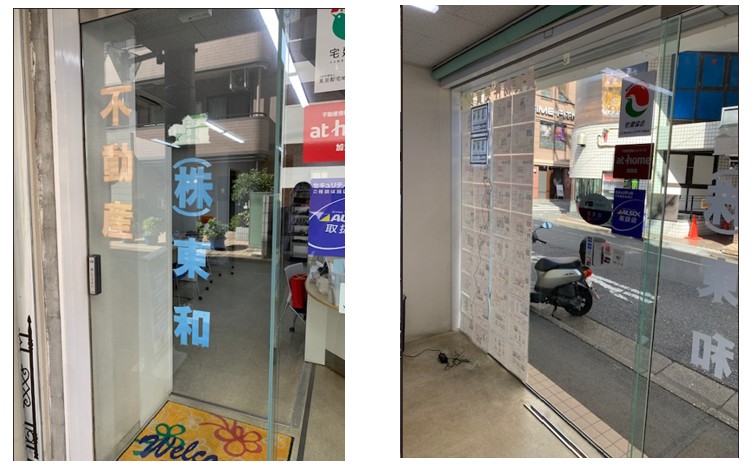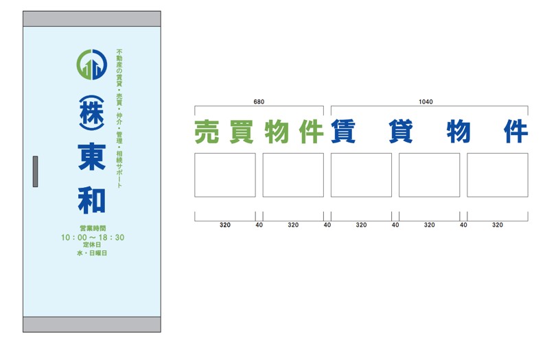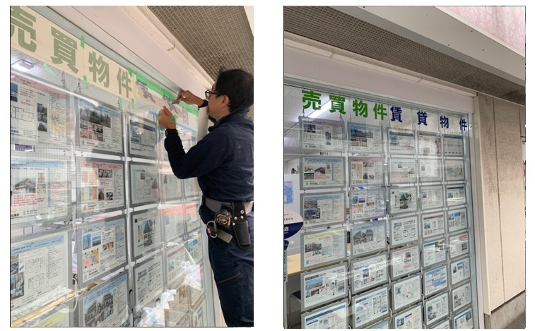 店舗入り口横のガラス貼り部分の不動産情報の量を増やしてかつキレイに見せたいとのご要望。