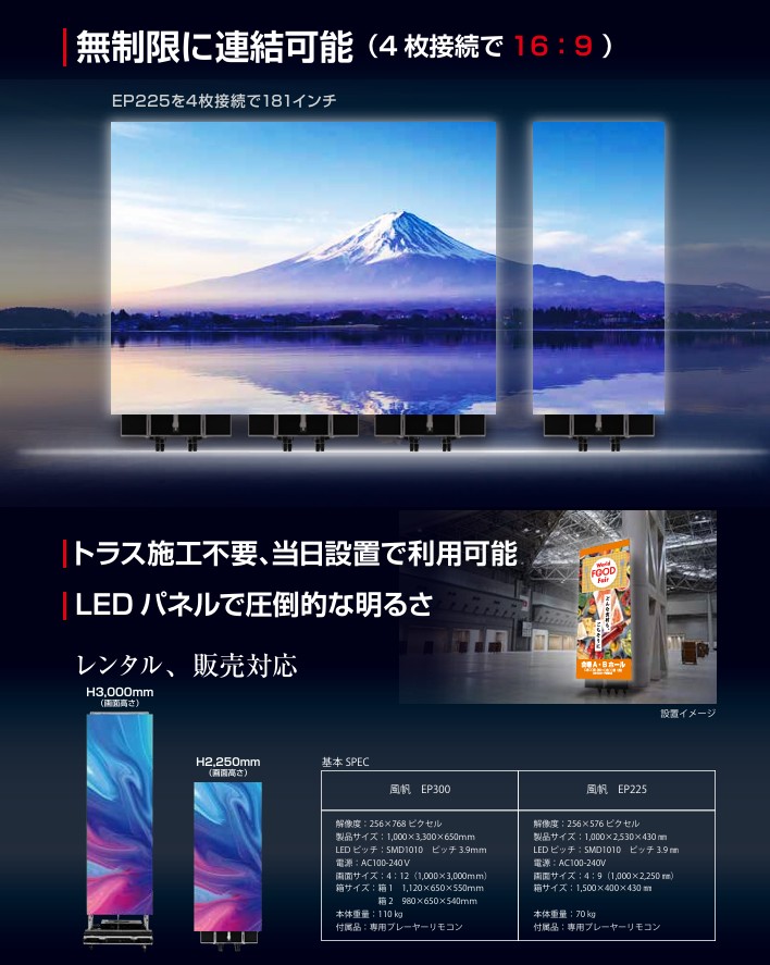 W1,000×H2,530のLEDモニターが当日設置で利用可能。