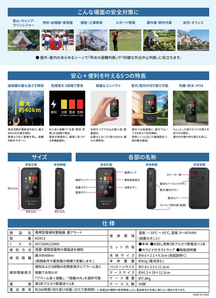 【新商品】携帯型雷検知警報器 雷アラート KO413