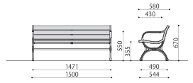 仕様/背・座 表面被:ASA樹脂 内部:ABS樹脂 (再生100%) 脚肘:鉄鋳物 粉体塗装 重量:75kg 脚にアンカーボルト用の穴が設けてあります。(φ12mm) |
