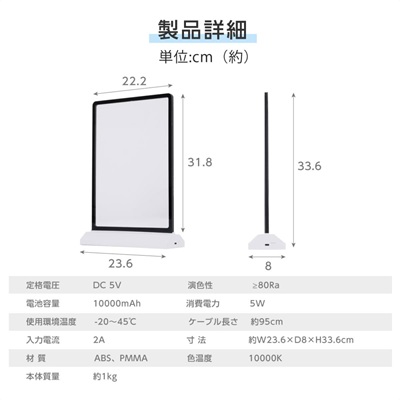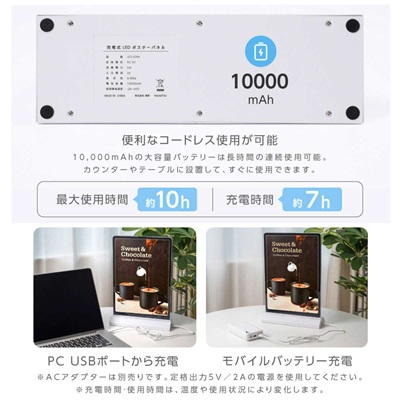 | 特記事項 | 定格電圧:DC 5V 消費電力:5W 入力電流:2A使用環境温度:-20~45℃ 電池容量:10000mAh ※ACアダプターは付属していません。定格出力5V/2Aの電源を使用してください。 ※充電時間・使用時間は温度や使用状況により変化します。 |