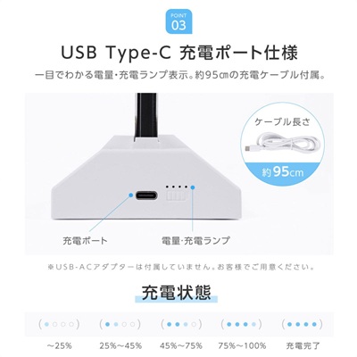 USB-TypeCのケーブルでパソコン・モバイルバッテリーから充電し、