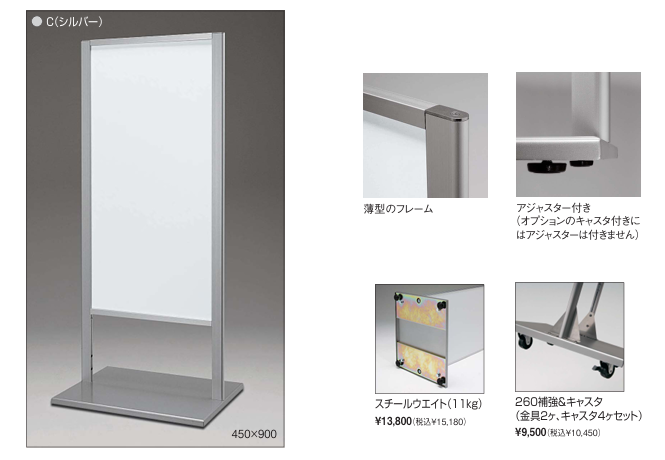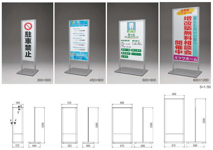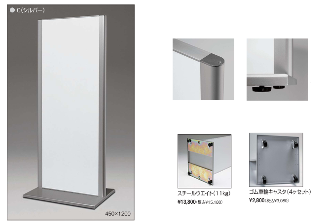 フレーム:アルミ押出材 アルマイト仕上 面 板:3mmアルミ複合板 1枚 ベース:スチール塗装仕上 特注サイズ可能です。 * 面板サイズ (W300~600 × H300~1200 以内) |