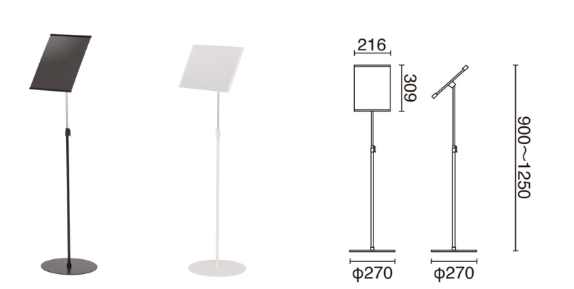 | サイズ:H900~1250 板面:216×309 画面寸法:216×292 ベース:Φ270mm、ベース厚み:約3mm 素材:スチール製 アタッチメント金具:樹脂、メッキ仕上 板面:ABS樹脂 前面カバー:塩化ビニル製 重量:約2.0kg |